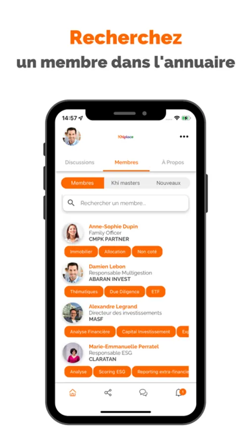 Recherchez facilement un membre de la communauté par nom, prénom, entreprise, compétence... L'essentiel pour faciliter vos échanges !