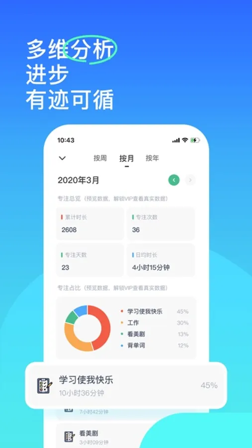 - Focus statistics: focus time summary/days/trend statistics/pie chart statistics, etc.
