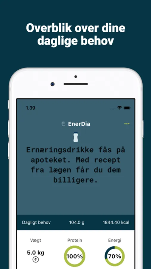Denne app giver muligheden for at angive dit ernæringsindtag og vægt, og sætte det op imod dit ernæringsbehov og -mål. Der kan også angives oplevede ubehag og fysiske aktivitet.