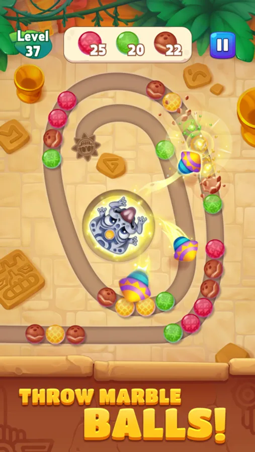 2) Choose the right color of ball in frog’s mouth and shoot it to the chain of marble balls;