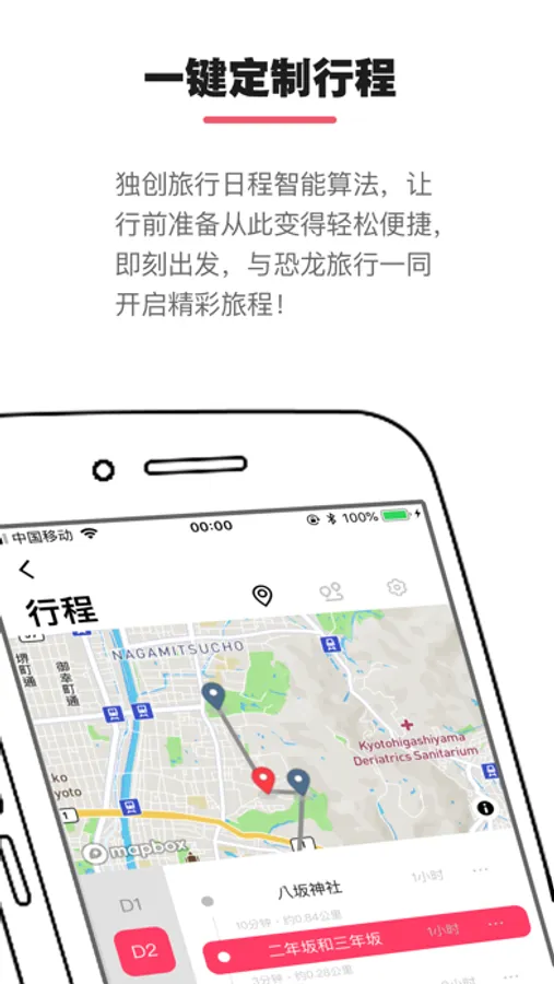 点击选取感兴趣的目的地,设定停留时间,恐龙黑科技会自动为您计算规划出最佳游玩线路,或根据您的偏好自行调整,一份私人定制的详细日程和旅行地图5分钟轻松搞定。