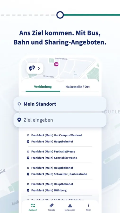 So sind Sie einfach, schnell und bargeldlos unterwegs. Geben Sie Ihr gewünschtes Ziel ein und lassen Sie sich direkt von Ihrem Standort aus eine aktuelle Verbindungsauskunft für Bus und Bahn anzeigen. Mit nur einem Klick orientieren Sie sich auf der Kartenansicht. Bei Bedarf kombinieren Sie Ihre Verbindung mit Sharing-Angeboten oder lassen sich einen Fußweg anzeigen. Echtzeitdaten mit aktuellen Verkehrsmeldungen und Auslastungsprognosen helfen Ihnen beim Planen der besten Route.