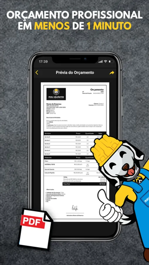 Mas não é só isso! Com a nossa funcionalidade de recibo em formato PDF, você pode compartilhar facilmente os seus orçamentos e recibos com seus clientes e colegas de trabalho, mostrando a todos o quão profissional é o seu trabalho.