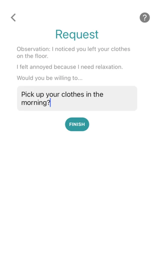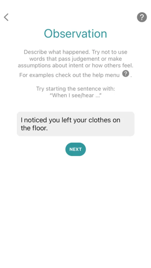 At its core, Nonviolent Communication is about communicating honestly and receiving empathetically, a way of communicating that “leads us to give from the heart” (Rosenberg). For conflicts, this app will walk you through the four key parts: observation, emotion, need, and request. This app will walk you through these four key steps to create statements that you can use with the person you are in conflict with.