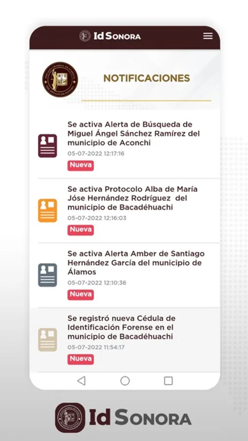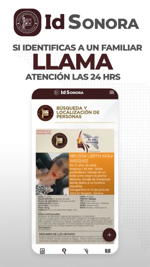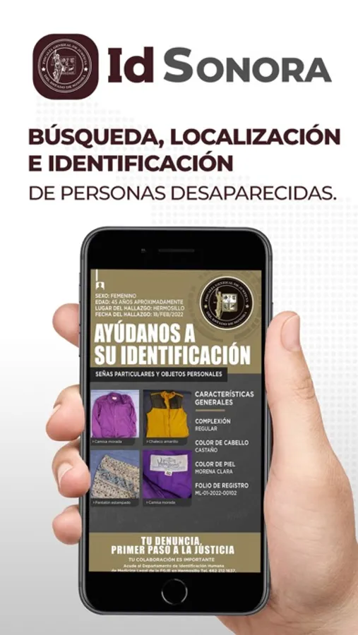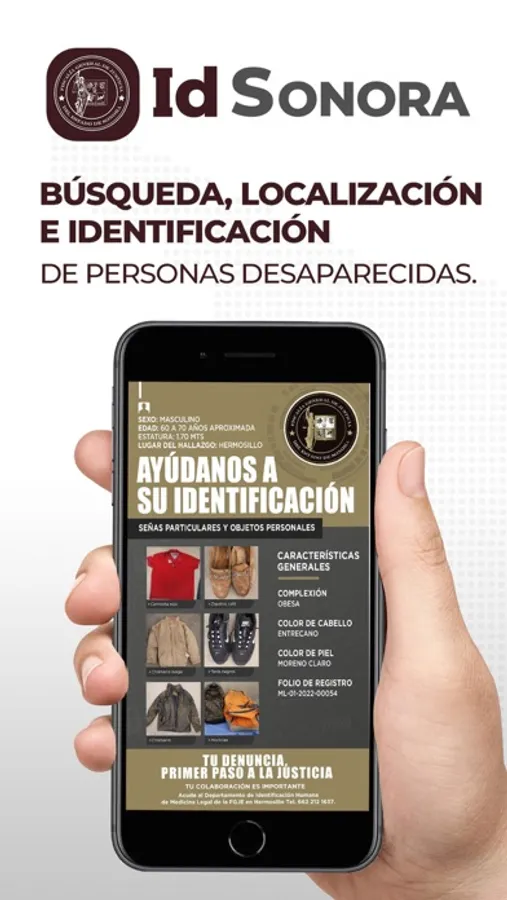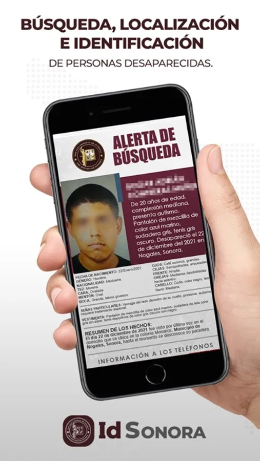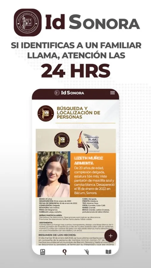 El Gobierno del Estado de Sonora y La Fiscalía General de Justicia, en cumplimiento de un compromiso con la ciudadanía en general y muy especialmente con los Colectivos ciudadanos de búsquedas, pone a disposición la aplicación “IdSonora” en un esfuerzo por lograr incrementar la identificación de personas fallecidas y de localizar personas extraviadas y/o desaparecidas.