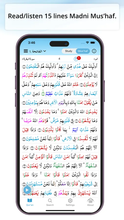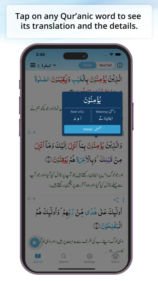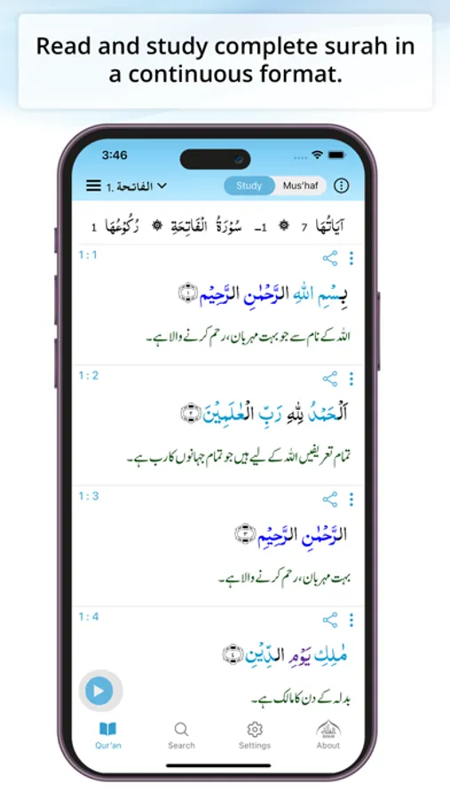 - Special features of study mode include detailed study of an ayah with the option to make notes, bookmark the study page and ability to share with others.