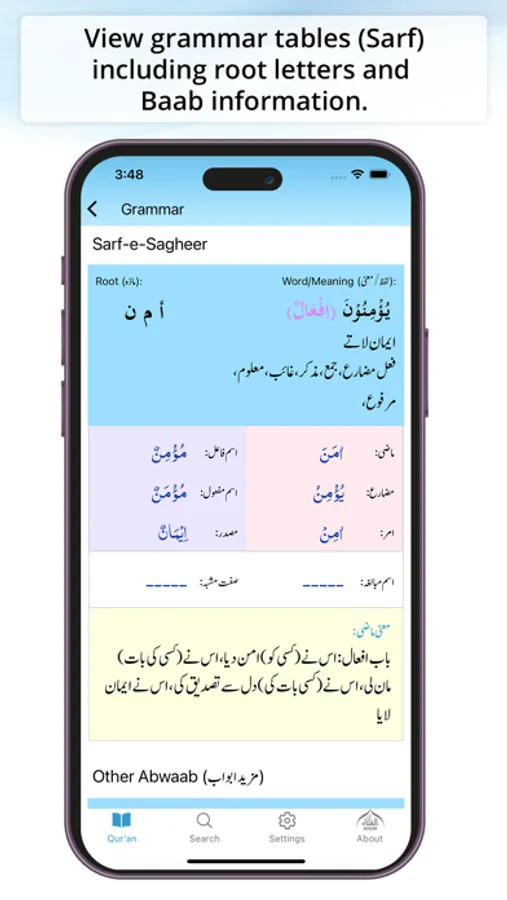 - Another prominent feature of the app is that it lists the ‘past’ meaning (ماضی) of every verb in the grammar tables and the meaning is taken from the dictionary of Lutf-ur Rehman Khan.