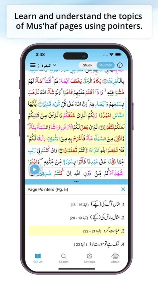 - Understand the subject matter of each page of the Qur’an, by dividing it into four parts called Pointers, which help to: