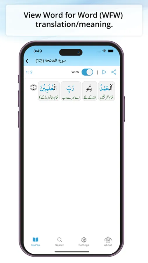- Recite & / or listen to the Qur’an with or without translation – running translation or WFW [Word for Word] (Urdu/English)