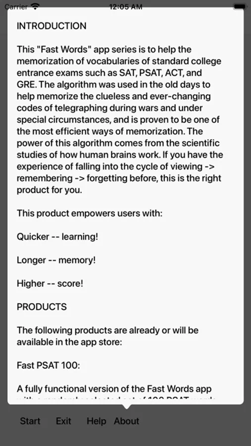 This app is to help the memorization of 2,912 SAT words. The algorithm was used in the old days to help to memorize the clueless and ever-changing codes of telegraphing during wars, and is proven to be one of the most efficient ways for memorization.