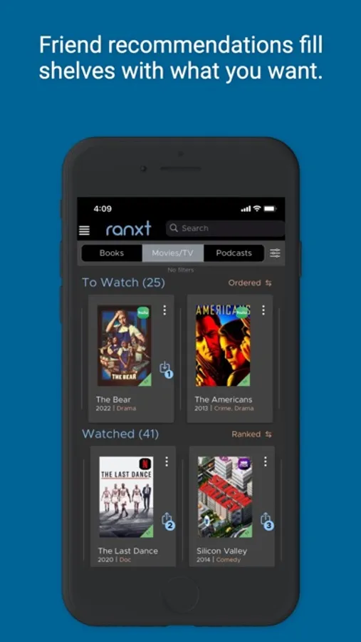 * ranxt enables ordering of your lists, making it easy for you to decide what to read, watch, or listen to next.