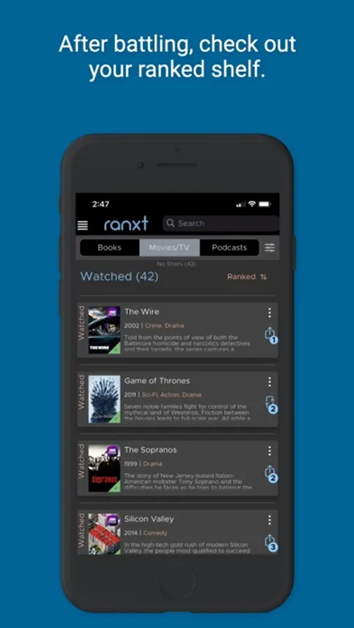 * Rank Battle is a unique feature of the ranxt app that helps you to compare two titles side-by-side and vote on your favorite.