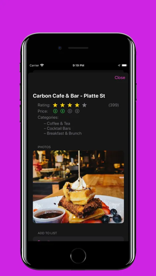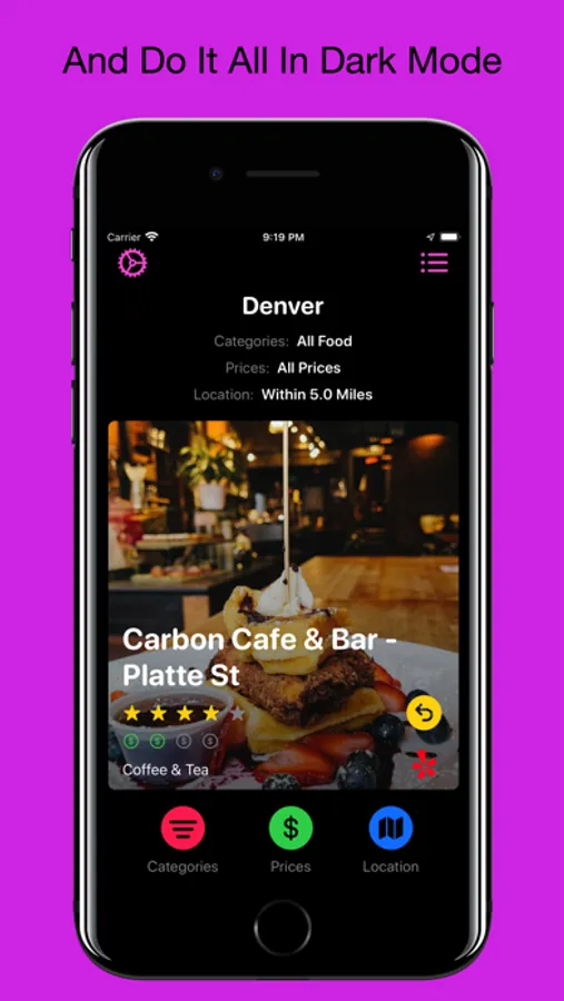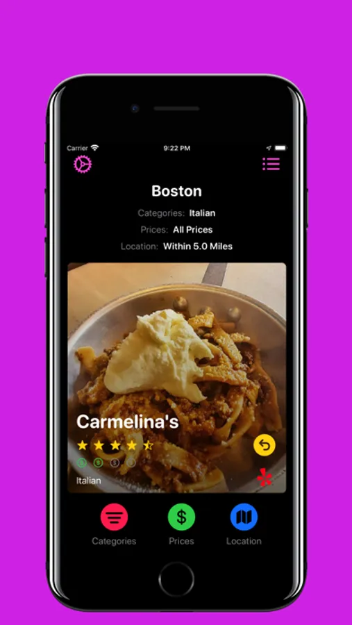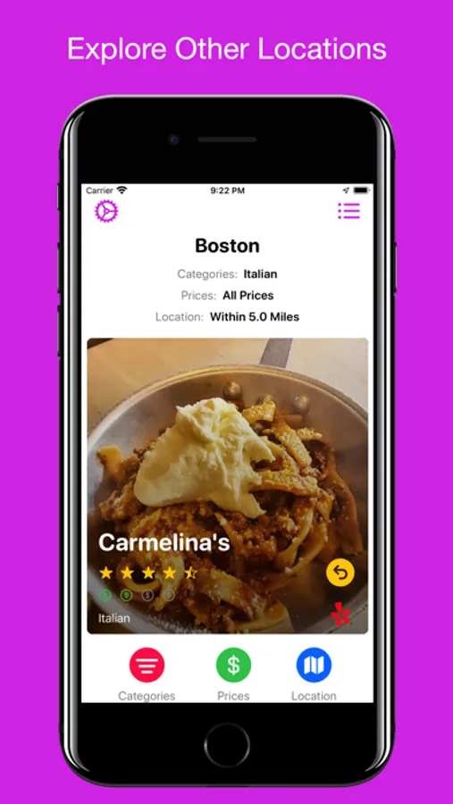 * Filter by category, currently open, price, and location