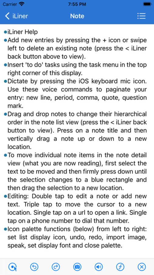 Add new entries by pressing the + icon or swipe left to delete an existing note (press the iLiner back button to view). Insert 'to do' tasks using the task menu in the top right corner of this display. Dictate by pressing the iOS keyboard mic icon. Use these voice commands to paginate your entry: new line, period, comma, quote, question mark. Drag and drop notes to change their hierarchical order in the note list view (press the iLiner back button to view). Press on a note title and then vertically drag a note up or down to a new location.To move individual note items in the note detail view (what you are now reading), first select the text to be moved and then firmly press down until the selection changes to a blue rectangle and then drag the selection to a new location.Editing: Double tap to edit a note or add new text. Triple tap to move the cursor to a new location. Single tap on a url to open a link. Single tap on a phone number to dial that number.Icon palette functions (below) from left to right: set list display icon, undo, redo, import image, speak, set display font and close palette.