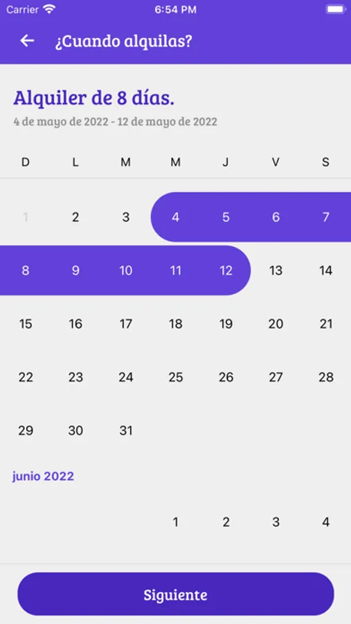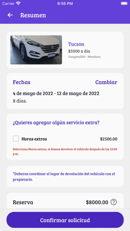 2- Elige las fechas de inicio y finalización de tu viaje desde el calendario de solicitud del vehículo y aguarda la confirmación del propietario en las notificaciones.