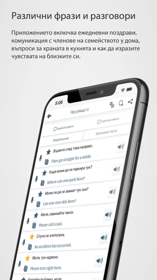 Приложението също така предлага възможност да чуете изречението на глас от англоговорящите.