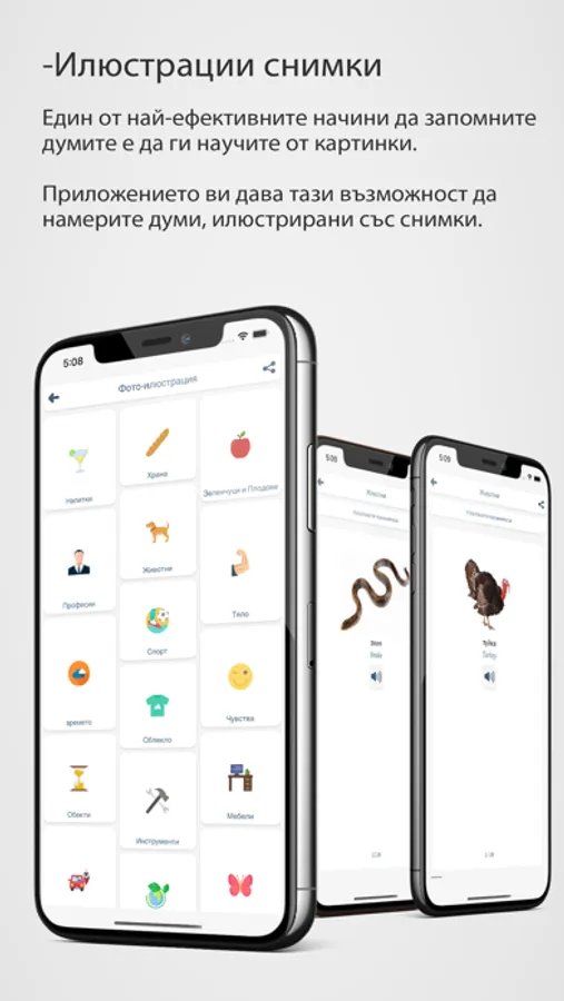 Един от най-ефективните начини да запомните думите е да ги научите от картина. Приложението ви позволява да намерите думи, илюстрирани със снимки.