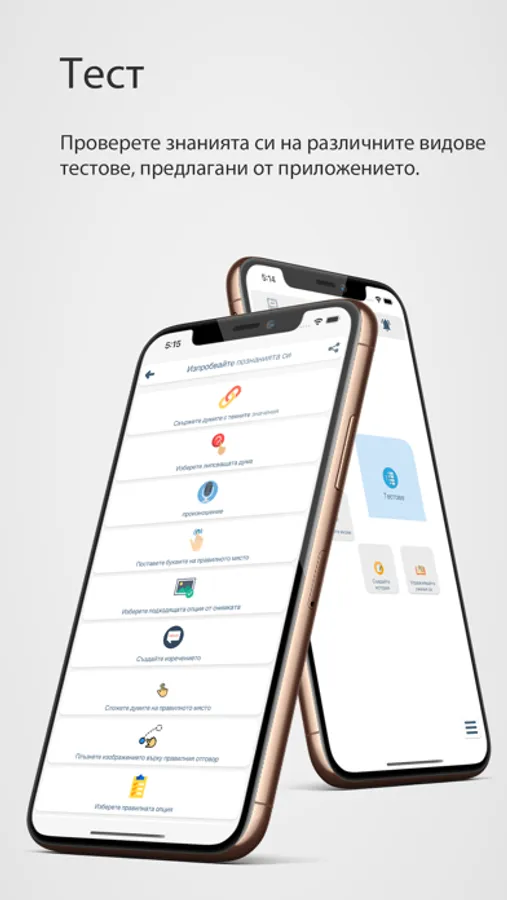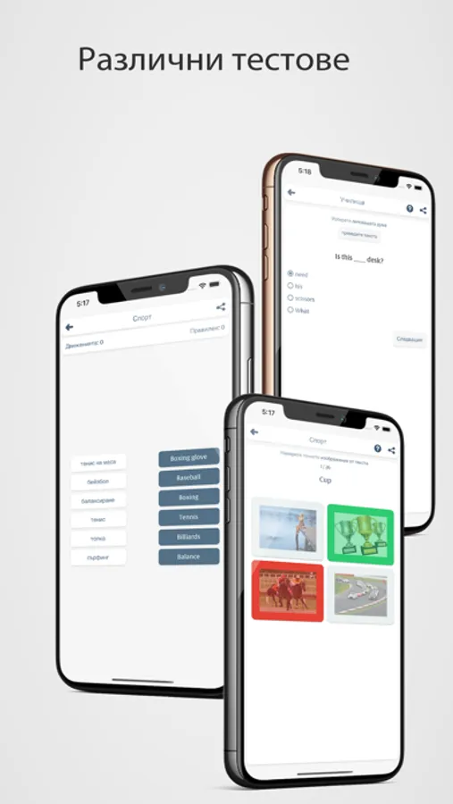Тествайте знанията си за различните видове тестове, които приложението предлага, като комбиниране на думи със същото значение, намиране на правилния отговор в картина, превод на дума или изречение, слушане и след това написване на изречение, изречение, което се появява и Повече ▼.