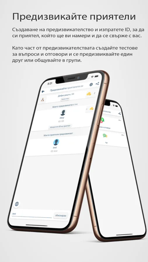 Създайте предизвикателство и изпратете ID на приятел, който ще ви намери и ще се свърже с вас. Като част от предизвикателствата, създавайте тестове с въпроси и отговори и предизвиквайте взаимно или общувайте в групи.