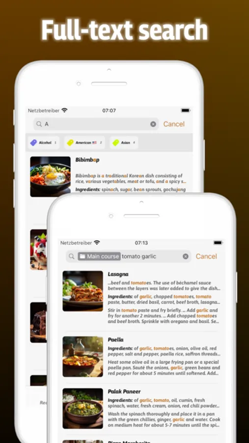 Search your entire collection quickly and efficiently. Find recipes by ingredients, names, or any keywords.