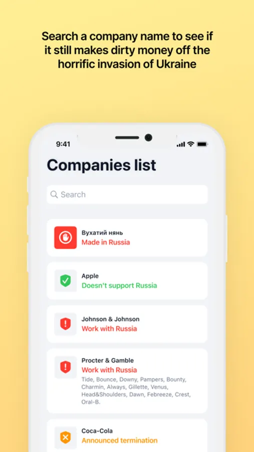 The primary purpose of our application is to put pressure on companies that are still conducting business in Russia. We urge them to leave the aggressor county and minimize their operational presence in the region. At the same time, there are more than 3200 Russian-owned trademarks on the shelves of Ukrainian stores. There are hundreds and thousands of goods that people may unknowingly buy and directly support the Russian economy. International sanctions against Russian companies and companies that directly or indirectly support the war in Ukraine, is a crucial step towards peace. Similarly, economic embargo aims to dramatically reduce financial infusions to Russia
