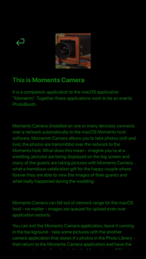Moments Camera (installed on one or many devices) connects over a network automatically to the macOS Moments host software. Momemts Camera allows you to take photos (still and live), the photos are transmitted over the network to the Moments host. What does this mean - imagine you're at a wedding, pictures are being displayed on the big screen and many of the guests are taking pictures with Moments Camera... what a huge celebration gift for the happy couple where forever they are able to view the images of their guests and what really happened during the wedding.