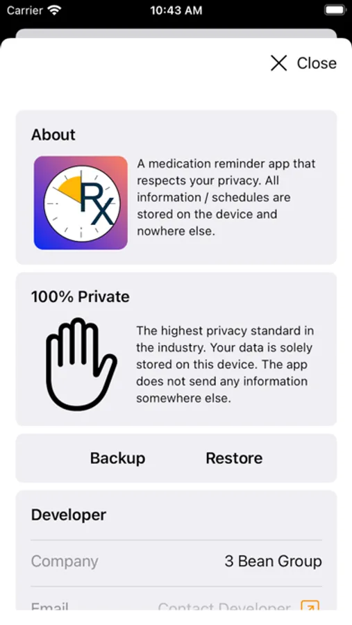The highest privacy standard in the industry. Your data is solely stored on this device. The app does not send any information to anyone that could use your private information.