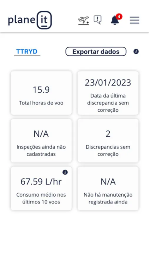 - Visibilidade das horas disponíveis, vencimentos e consumo médio da aeronave a todo momento