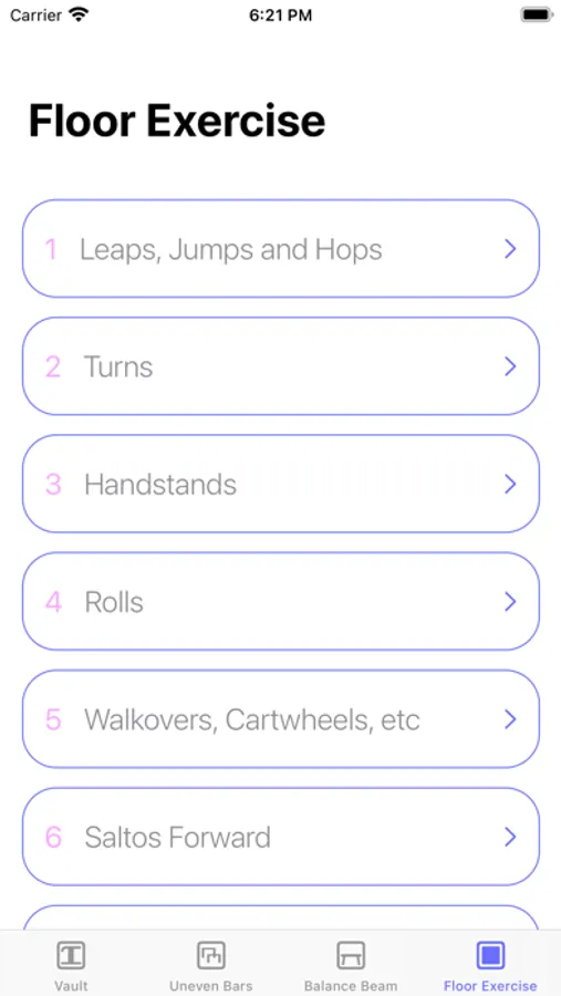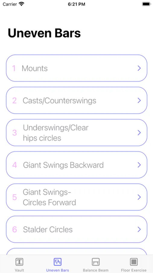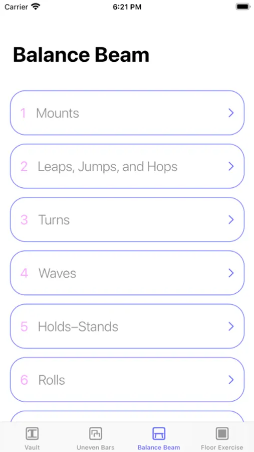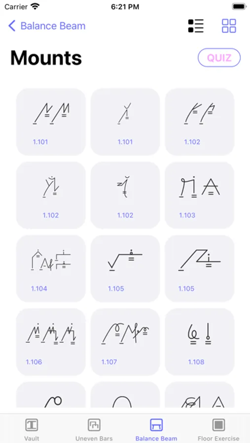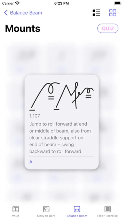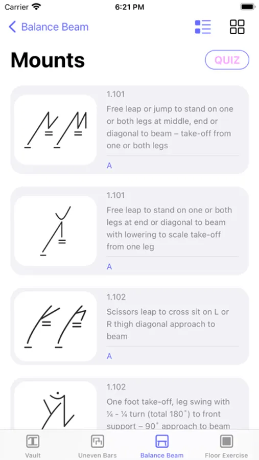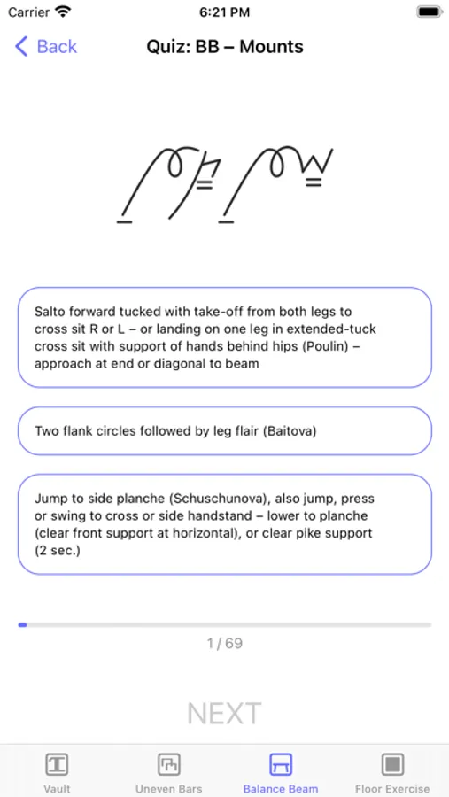 Professionally drawn symbols, user-friendly interface, clean design, and quizzes for every category, make it a perfect tool for learning and memorizing the gymnastics symbols, elements descriptions and difficulties.
