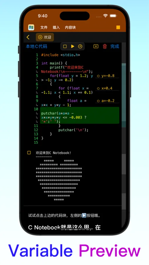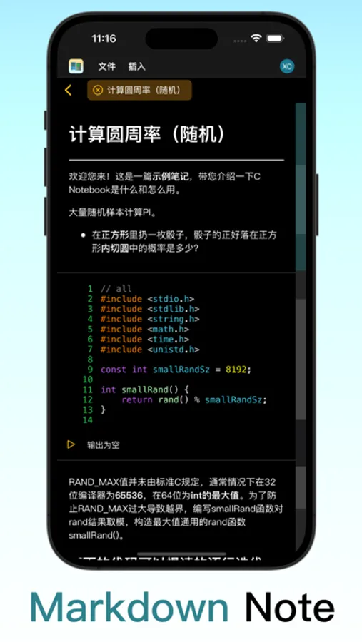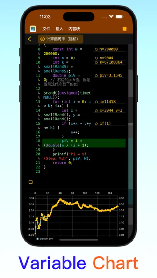 At present, the notebook supports C language writing and local debugging and running, and a series of excellent debugging methods are specially designed for the notebook: for example, during the running process, you can see the value of the variable at any time, and you can also change it at runtime The value of the variable, and even you can display the change trend of the variable value as a graph, which allows you to use C language to quickly simulate the classic probability theory experiment, and witness the convergence process of the variable value with your own eyes, which is much clearer than using text to output the variable value .
