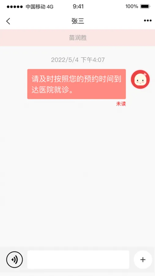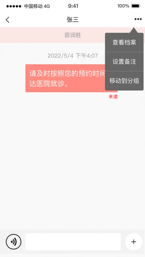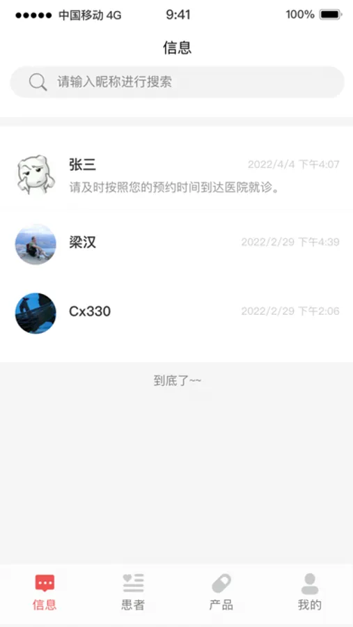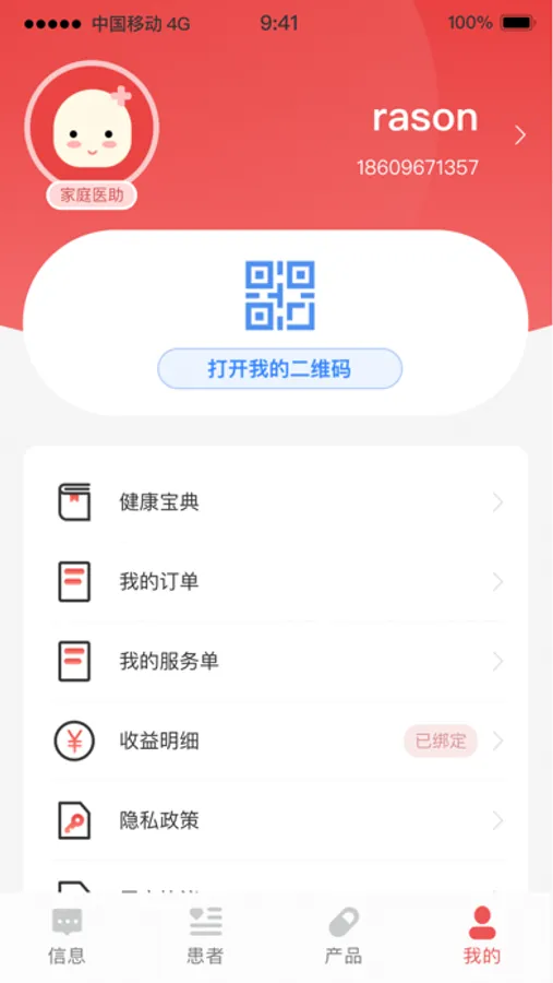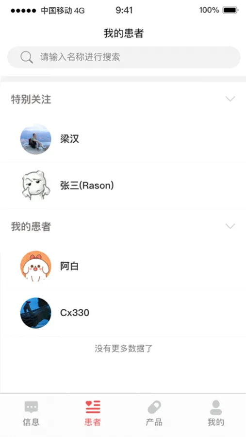 主要分为消息、患者管理、产品、我的四个功能模块。消息主要用于文字、语音聊天,患者管理可对患者进行分组;产品模块主要是查看自己经营哪些产品及服务;我的模块,可对个人信息、订单等进行查看及修改。