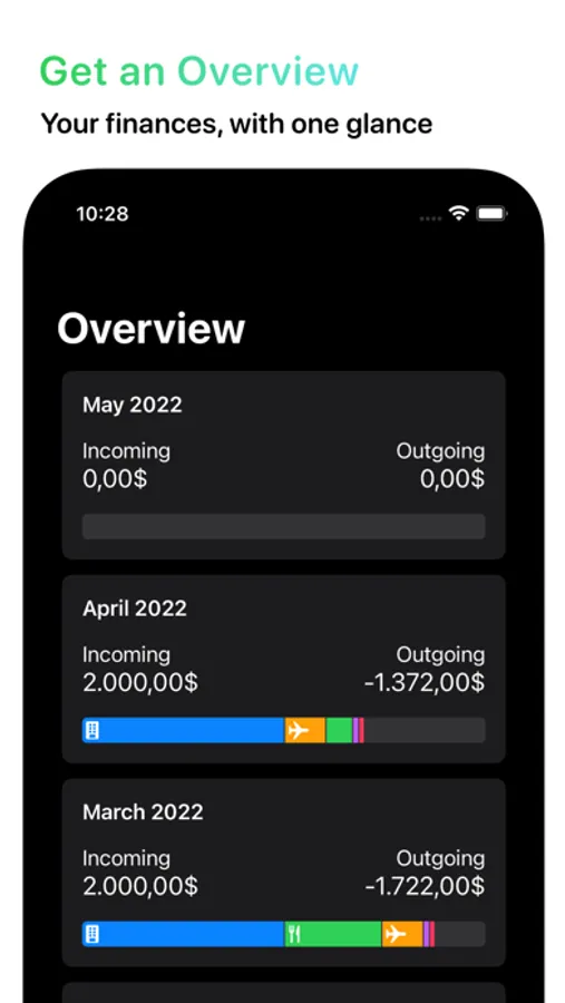 With FIN you keep track of your Expenses and your Income. FIN turns your bank account history into easy to understand Charts and Metrics. A quick glance gives you all the information you need, to understand your monthly finances and make better financial decisions.