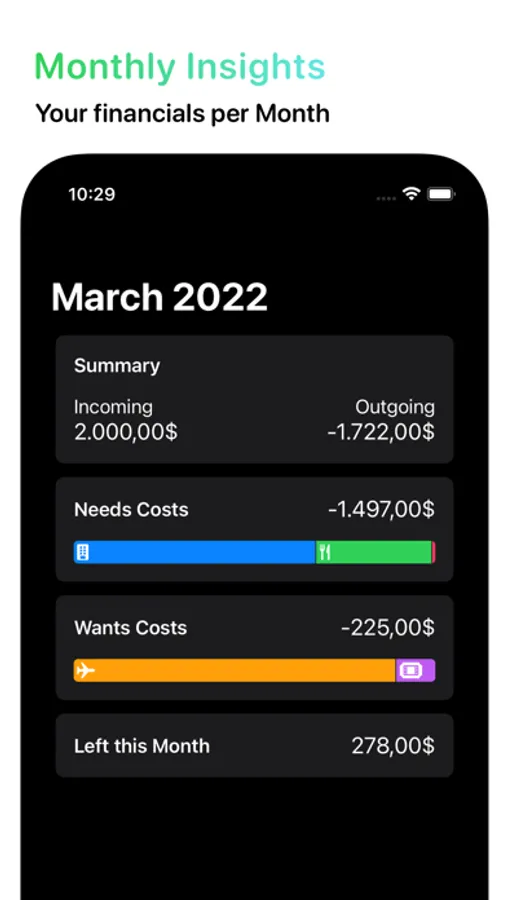 Metrics provide you with Charts and Summaries about your Daily Spendings. You can see where you spend the most money, and where you have potential for extra savings. Not every Metric fits every lifestyle, you can change your Metrics any time to adapt the Monthly View to your needs.