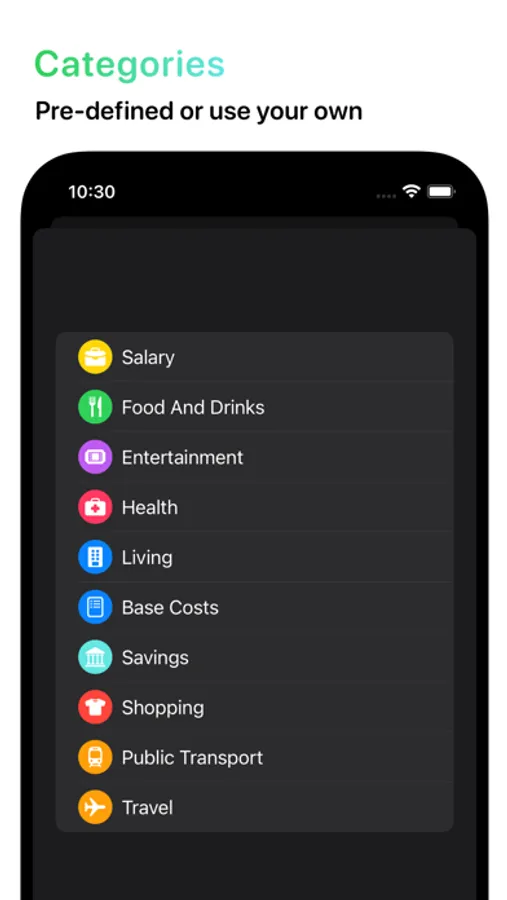 With Categories you can group similar Transactions together to get an overview about your cashflow. FIN already has pre-defined Categories for you, but you can also add your own, this way FIN fits exactly your needs.