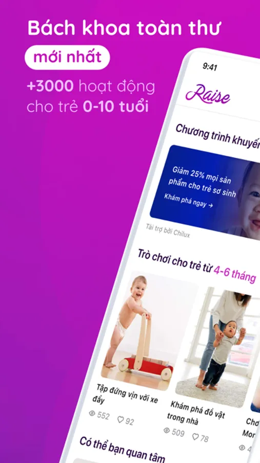 - Raise Vui chơi: Gợi ý +3,000 hoạt động hấp dẫn cho 4 nhóm tuổi từ 0-10, theo 05 nhóm phát triển: Thể chất, Nhận thức, Ngôn ngữ, Thẩm mỹ và Tình cảm - Kỹ năng Xã hội;
