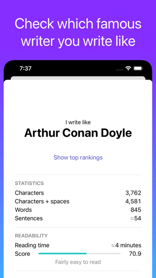 * Type your text and tap the "Analyze" button to get the complete analysis: an author similarity according to Bayesian probabilities, an accurate character and word count, and an approximate reading time and readability score.