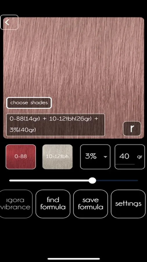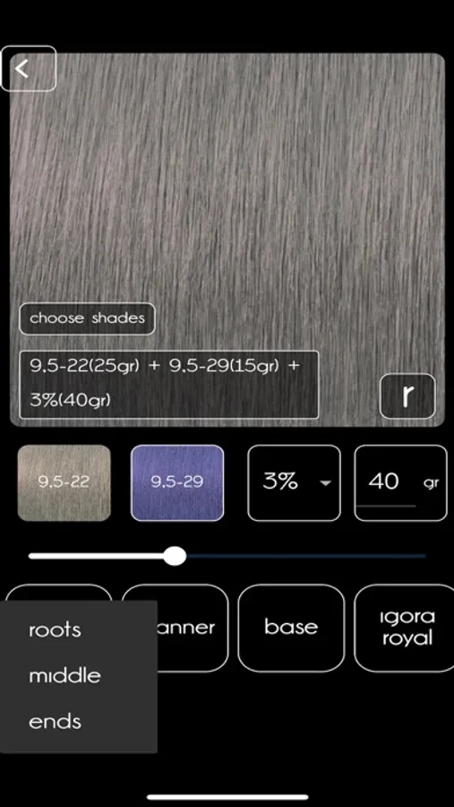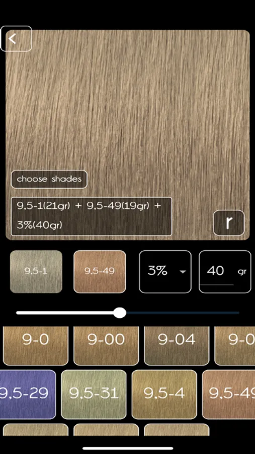 Choose shades from the color palette, change the oxidizers, the amount of product, and the application will show how the result will look. colorist S.H.E. will not allow you to do wrong things, for example, use inappropriate oxidizers, use inappropriate shades on super light blondes (bases).