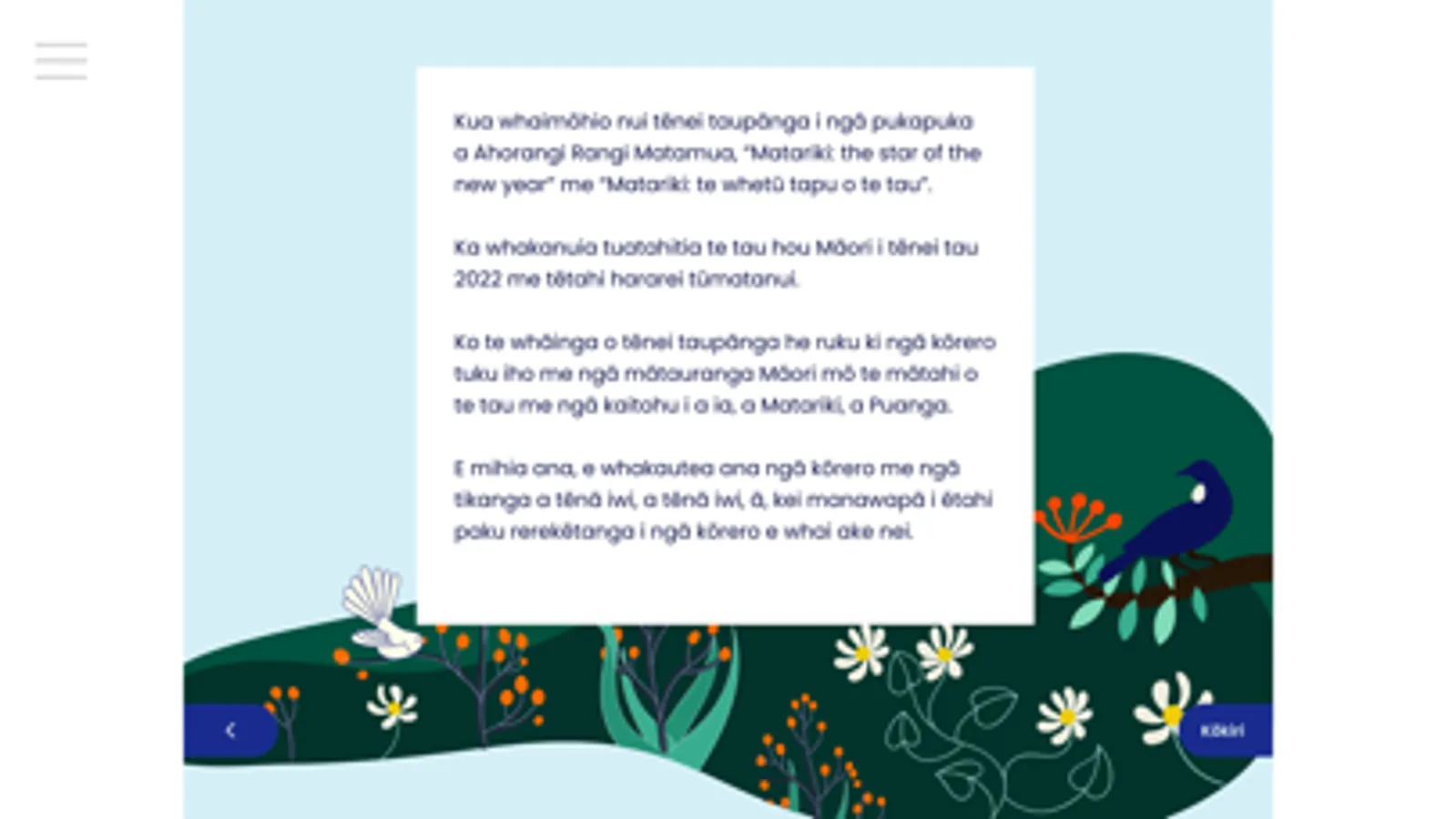- Multiple interactive puzzles and activities on the theme of Te Mātahi o te Tau specifically designed for the 0-6 years age group