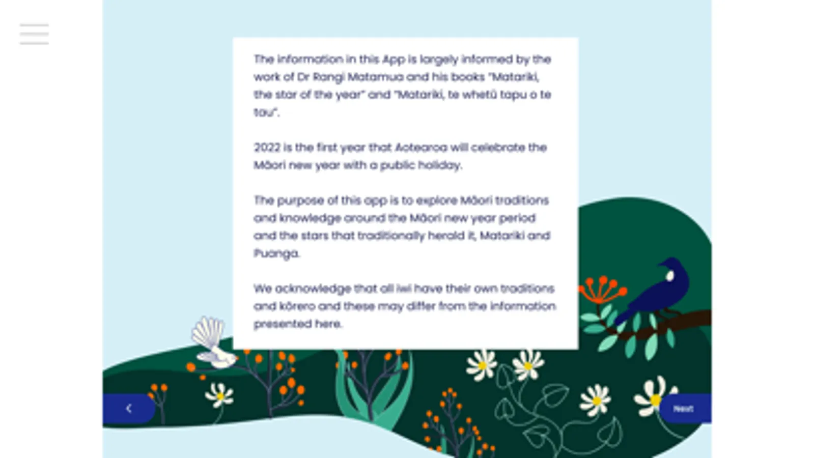 The purpose of this app is to explore Māori traditions and knowledge around the Māori new year period and the stars that traditionally herald it, Matariki and Puanga.