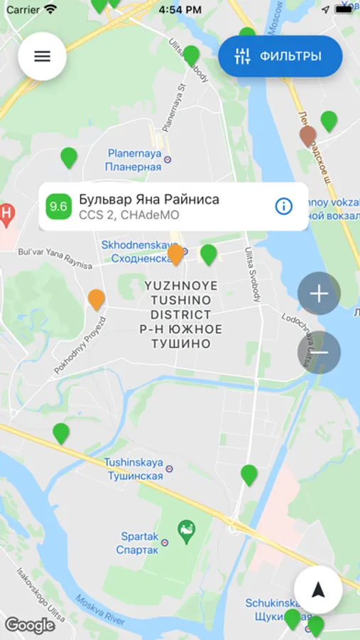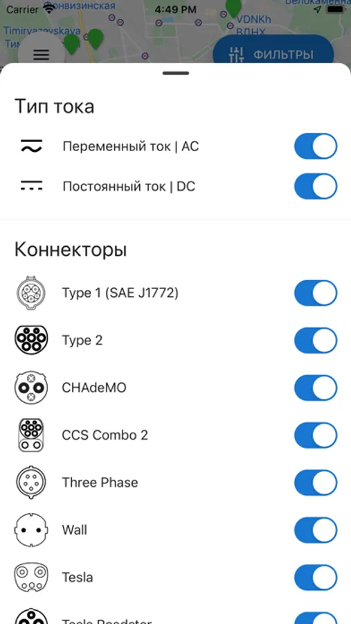 Отфильтруйте карту по типу разъема, включая: type 1, type 2 и DC зарядки такие как CHAdeMO и CCS, Tesla Supercharger.