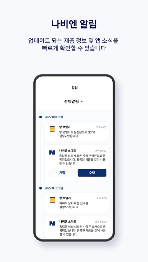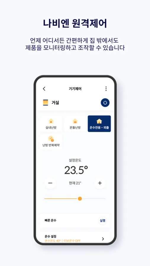 - 나비엔의 제품 등록 후 언제 어디서나 제품에서 제공하는 기능을 앱에서도 동일하고 더욱 편리하게 원격으로 제어할 수 있습니다.