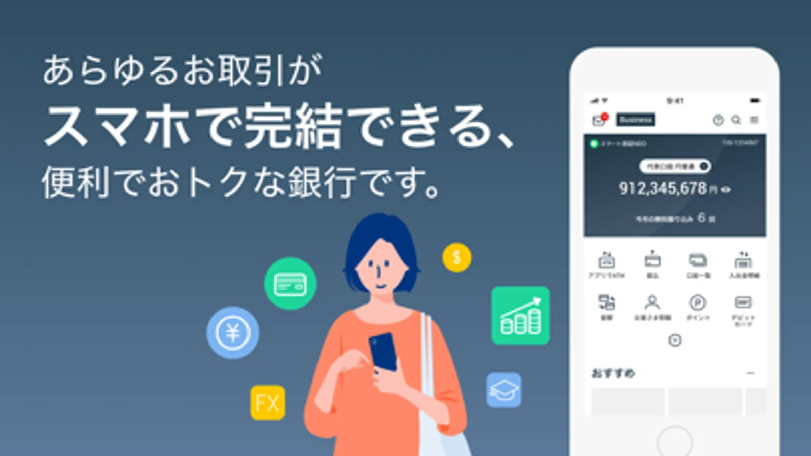 口座開設から、振込や残高照会はもちろん、ATMでの入出金まで、ほぼすべてのお取引がこのアプリ一つでご利用いただけます。