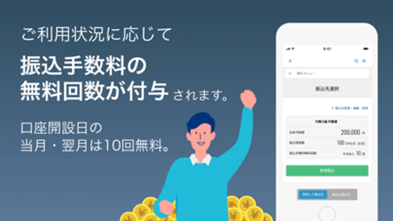 ・他の金融機関への振込手数料は、口座開設日の当月および翌月は10回無料、翌々月以降はご利用状況に応じて最大20回/月まで無料です。