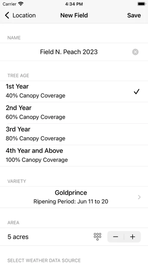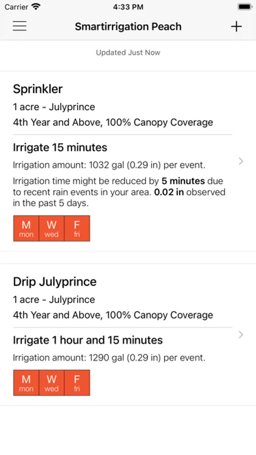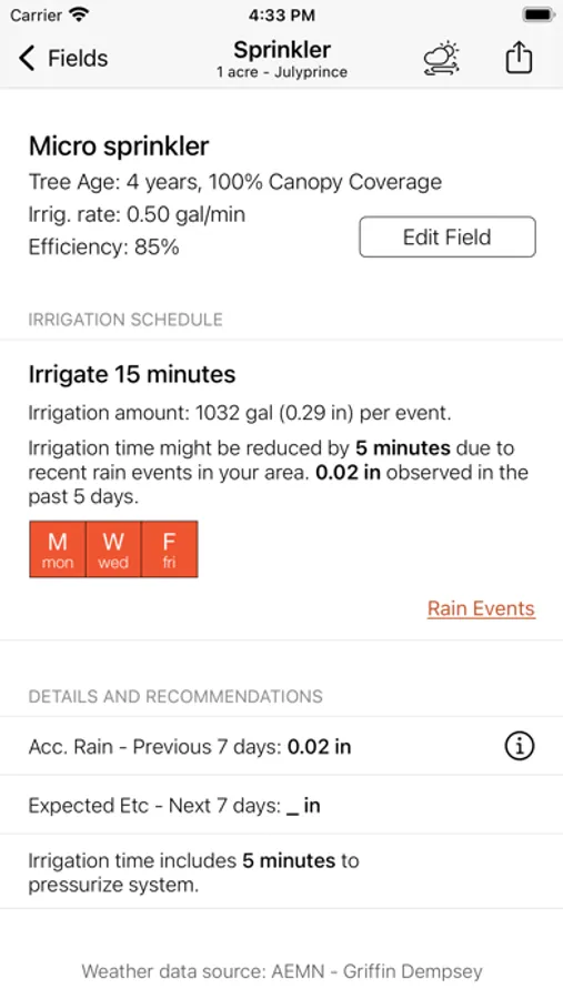 Users can register multiple fields. The app sends push notifications with irrigation duration recommended per event for a specific orchard. In addition, it will remind the users to adjust irrigation durations after each perceived rain event.
