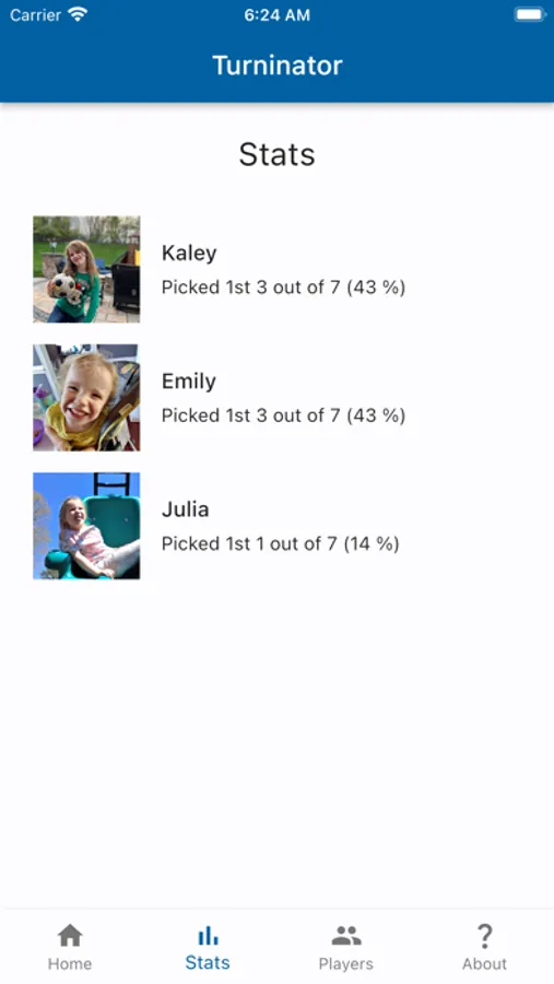 Turninator is a simple, fun app that lets you define a list of people and tell you who is up! Track stats so you'll be able to respond to "but she always goes first" with cold hard facts.