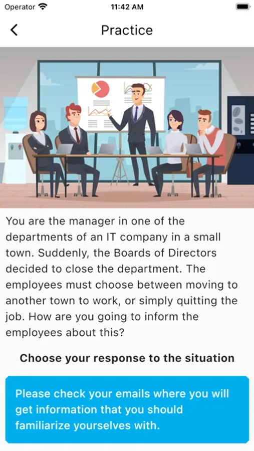 SayIT Soft Skills Trainer app is an innovative solution enabling IT professionals to raise their competencies in the area of soft skills. App users can develop their communication skills, problem-solving skills, teamwork skills, organisational skills and interpersonal skills. The training, based on the visual novel approach, is a combination of assessments and training content, enriched by visual elements. The app generates the visual novel from the database of available storyboards.
