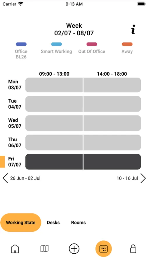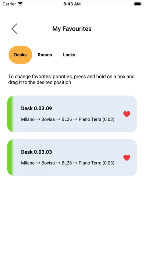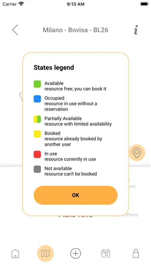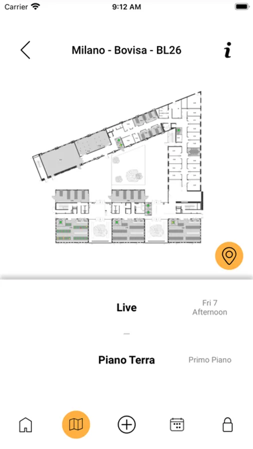 La app integra la tecnologia Workhera con funzionalità di ricerca, prenotazione e visualizzazione delle sale riunioni e desk disponibili.