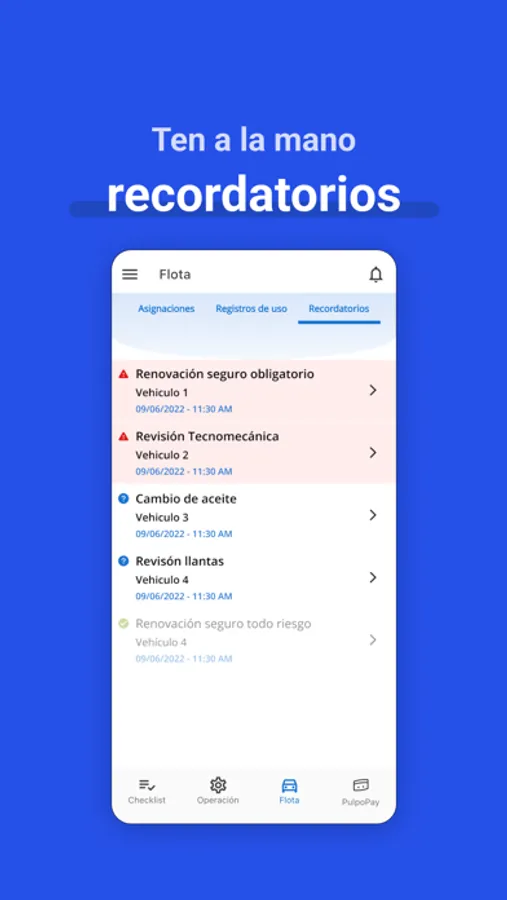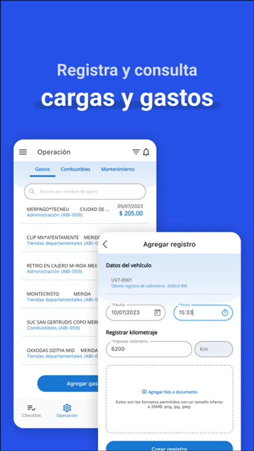 Tus conductores además podrán registrar sus cargas de combustible y odómetros para controlar el kilometraje, registrar gastos (viáticos, peajes, etc.) y consultar la documentación digital del vehículo.