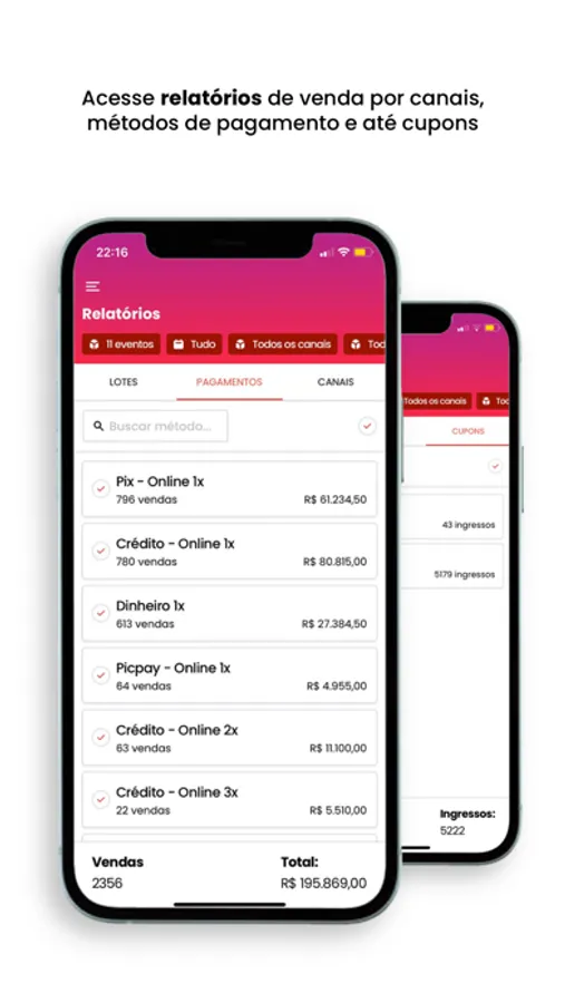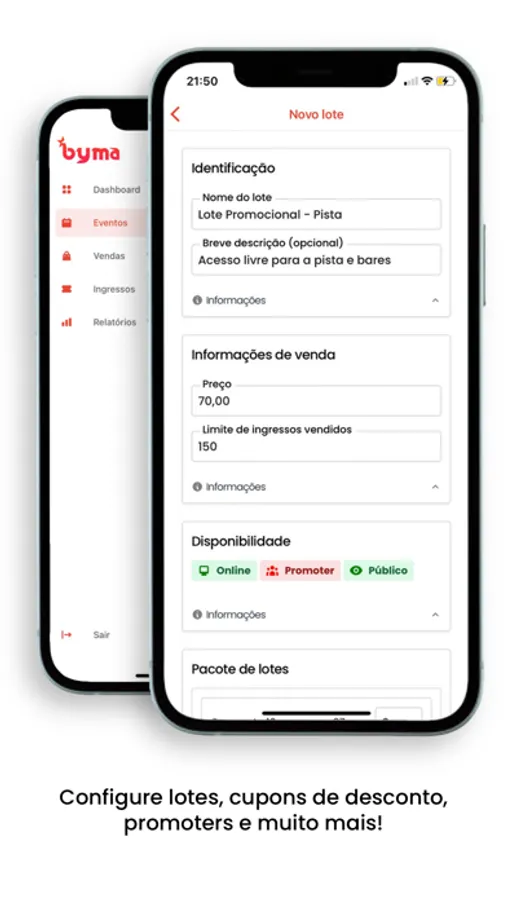 Dashboard com dados multi-evento; configuração de lotes, cupons de desconto e promoters; relatórios de venda por canais, por métodos de pagamento - e muito mais.