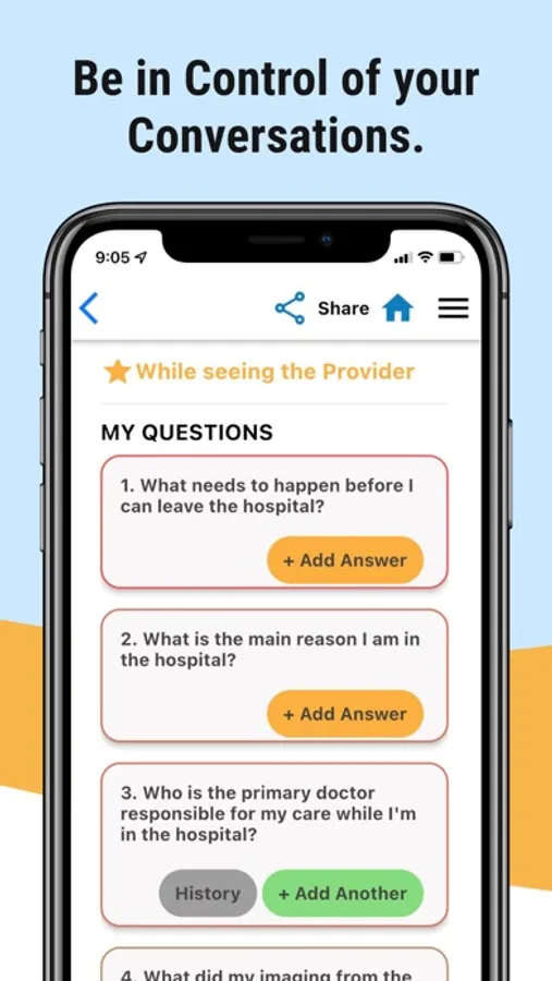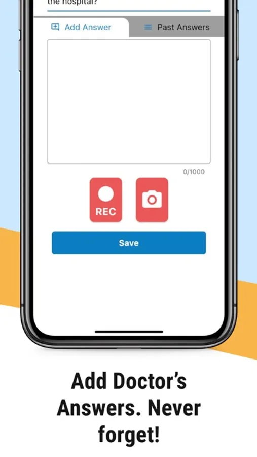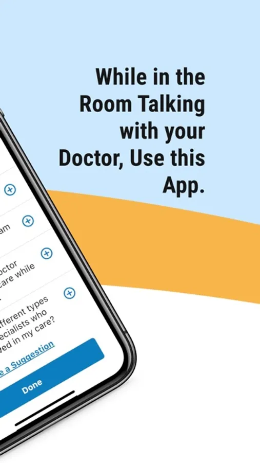 Feel Ready for your Doctor's Visit. View Suggested Questions. Write your Own. While in the Room Talking with your Doctor, Use this App. Add Doctor's Answers, Never Forget what was said! Be in control of your conversations. Keep your meds organized using photos of pill bottles. Don't feel overwhelmed during discussions with your doctors. Live a healthier life!